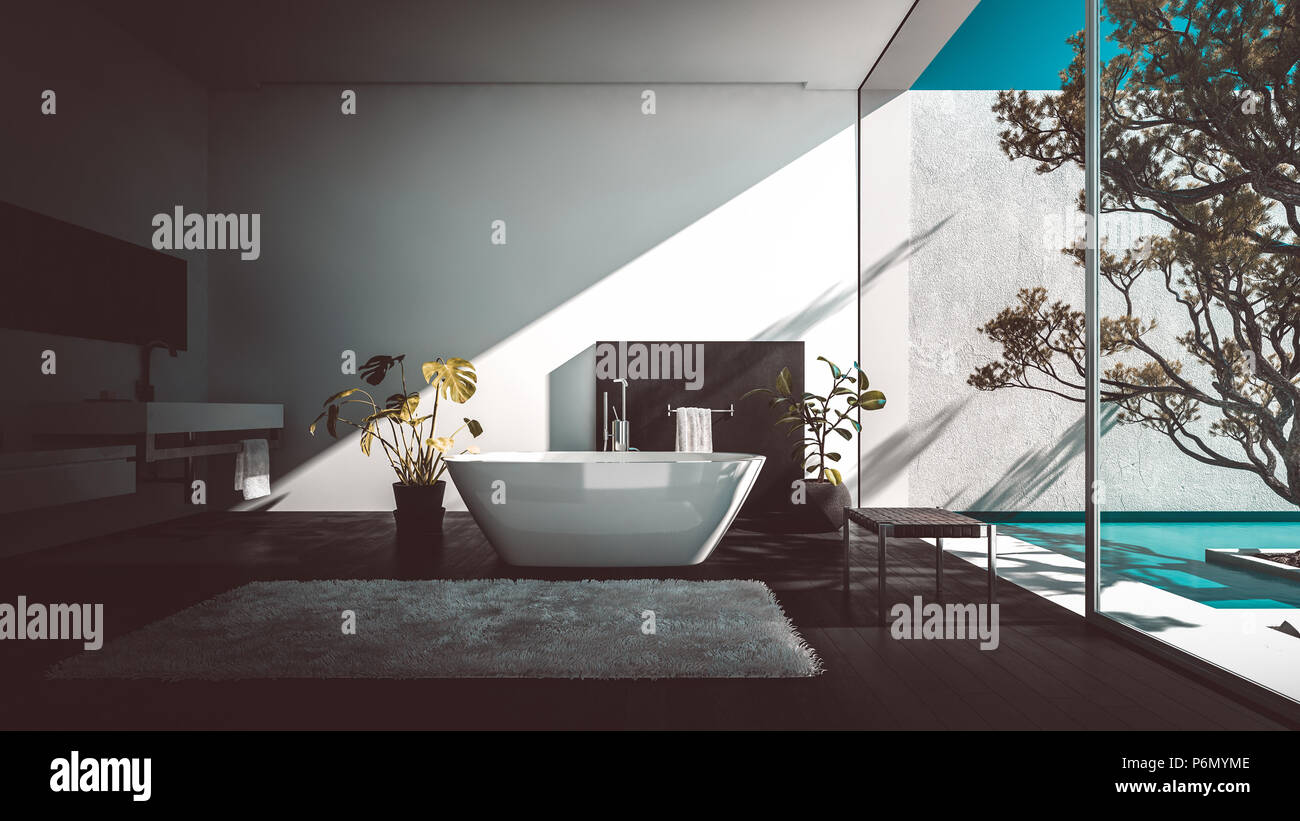 Stylish Modern Luxury Bathroom With Glass Wall Overlooking A Patio