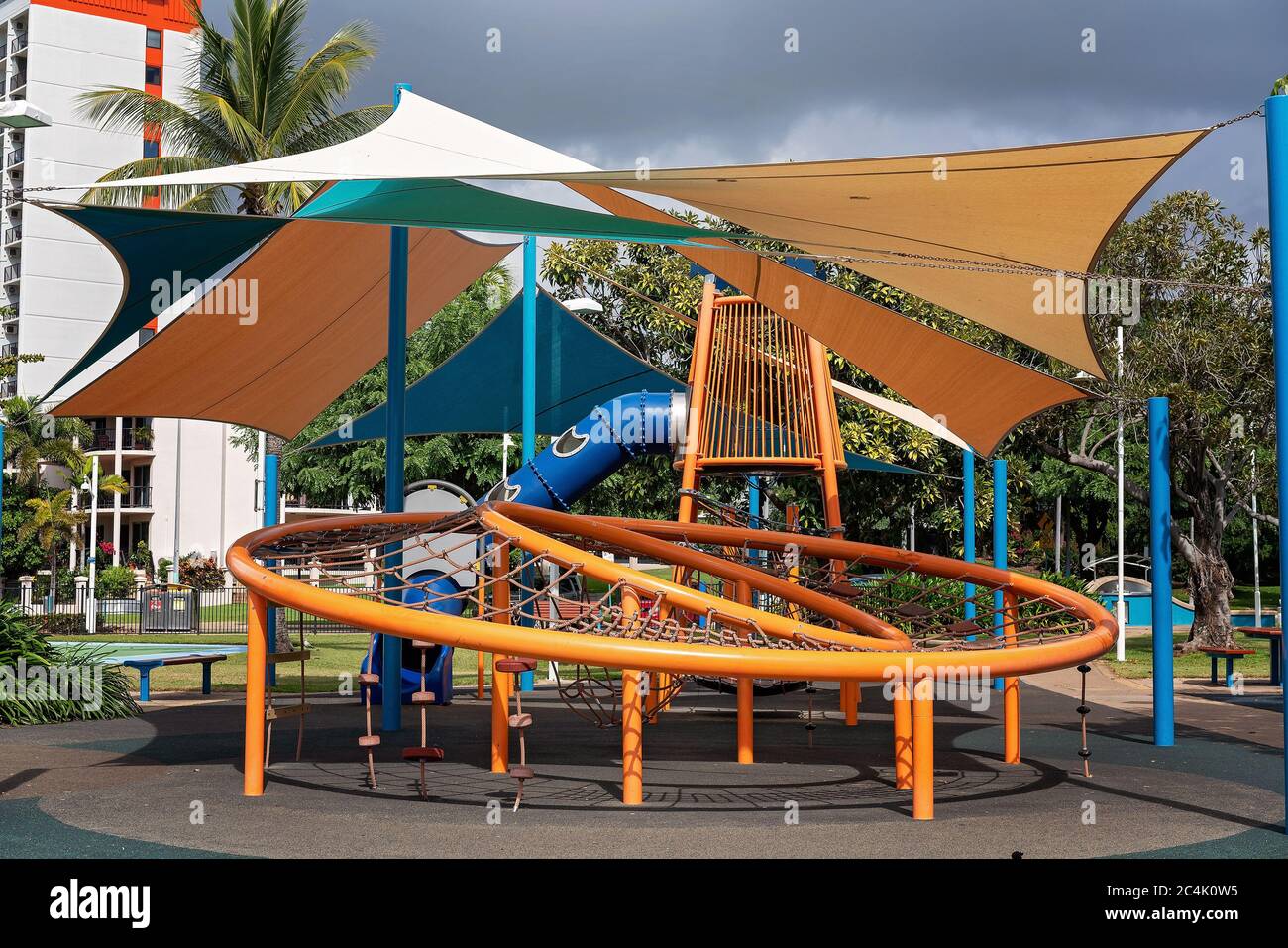 Un Colorido Patio De Juegos Para Ninos Con Ventas De Sombra Y Un