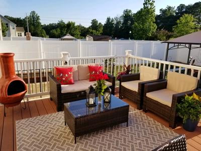 See photo examples and explanations of the differences among patio deck veranda porch and balcony. As a verb deck is uncommon to furnish with a deck as a vessel or deck can be to dress someone up to clothe with more than ordinary elegance. The definitions of the terms porch and patio are somewhat dependent on the region where you live. Most apartments either have a balcony or a patio as part of its amenities.